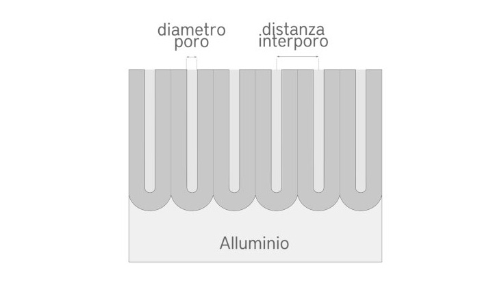 L’ossido di alluminio, formato mediante il processo di anodizzazione in acido solforico, ha una struttura microcristallina a nido d’ape, con celle di forma esagonale e con una porosità centrale che si estende per quasi tutta la profondità. Il processo di anodizzazione dura forma porosità con diametro di circa 20-40nm e distanza tra poro e poro di circa 100nm.
